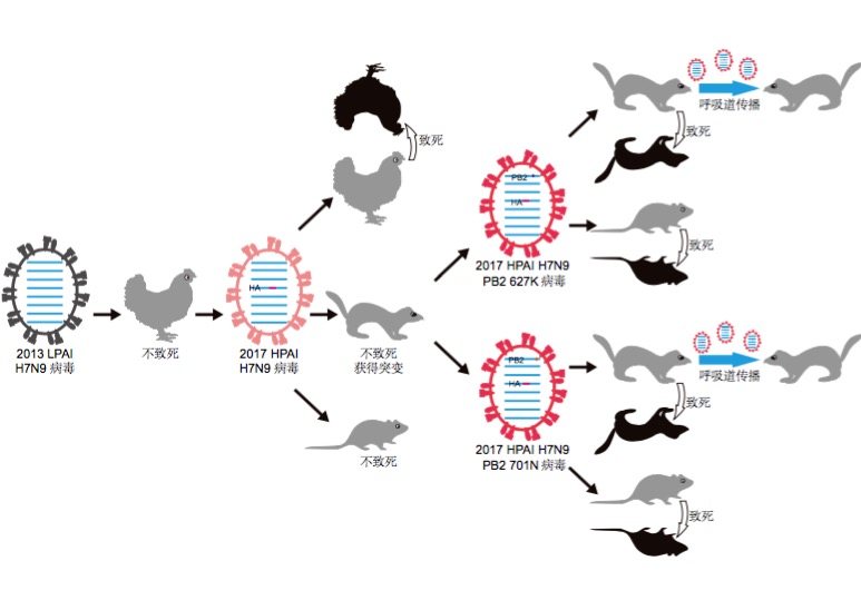 2013年7月至2017年1月期間,中國農(nóng)業(yè)科學(xué)院哈爾濱獸醫(yī)研究所國家禽流感參考實驗室從二十多個省的活禽市場、家禽養(yǎng)殖場和屠宰場共采集11萬多份樣品,分離到293株H7N9流感病毒?;蚪M解析發(fā)現(xiàn)這些病毒頻繁重組,共形成23種不同基因型,90%以上的毒株具有對人易感的分子特點。重要的是,今年1月在廣東分離的7株病毒在血凝素基因裂解位點發(fā)生變異。動物實驗發(fā)現(xiàn),這類變異株對雞具有高致死性,對小鼠和雪貂無致病力,但在雪貂體內(nèi)復(fù)制一代后即可獲得適應(yīng)哺乳動物關(guān)鍵突變,突變后的毒株對小鼠的致病力增加萬倍以上,可引起雪貂嚴重發(fā)病、死亡,并在雪貂之間經(jīng)呼吸道飛沫傳播。值得擔(dān)憂的是,H7N9病毒在人體內(nèi)復(fù)制時極易獲得這種突變。相關(guān)研究于10月24日在國際著名學(xué)術(shù)期刊《Cell Research》在線發(fā)表。施建忠副研究員等6人為共同第一作者,陳化蘭研究員為通訊作者。