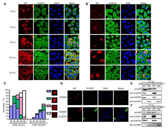 該實驗室博士生羅維玉和碩士生張杰在李呈軍研究員、姜麗副研究員和陳化蘭院士的指導下,篩選到與流感病毒NP蛋白直接互作的宿主蛋白磷脂爬行酶1(PLSCR1),發(fā)現(xiàn)PLSCR1通過與NP蛋白結(jié)合抑制NP和病毒核糖核蛋白復合體(vRNP)進入細胞核,延緩病毒整個復制周期,進而顯著抑制流感病毒的增殖。進一步研究發(fā)現(xiàn),PLSCR1、NP以及輸入蛋白α(Importin α)三者之間形成三聚體,阻礙細胞核輸入通路關(guān)鍵因子輸入蛋白β(Importin β)與Importin α的結(jié)合,阻止流感病毒NP和vRNP復合體通過主動輸入途徑進入細胞核,從而抑制流感病毒復制。