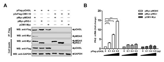 圖注:OASL蛋白與MDA5相互作用并增強MDA5介導(dǎo)的I型干擾素信號通路