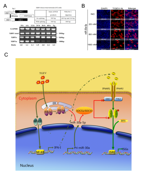 豬傳染性胃腸炎病毒(Transmissible Gastroenteritis Virus,TGEV)是一種有囊膜的單股正鏈RNA病毒,屬于α冠狀病毒屬。不同于豬流行性腹瀉病毒(PEDV),TGEV感染能夠誘導(dǎo)產(chǎn)生大量內(nèi)源性干擾素,但是病毒卻依然能夠高效復(fù)制,其具體的分子機制并不清楚。本研究中,研究人員發(fā)現(xiàn)TGEV感染能夠激活I(lǐng)RE1α介導(dǎo)的未折疊蛋白反應(yīng),促進TGEV復(fù)制。進一步研究發(fā)現(xiàn), IRE1α 通過調(diào)控microRNA中 miR-30a-5p的表達來促進病毒復(fù)制,下調(diào)表達的miR-30a-5p通過靶向細(xì)胞因子信號抑制蛋白SOCS1和SOCS3, 導(dǎo)致SOCS1和SOCS3在TGEV感染后期大量表達;上調(diào)表達的SOCS1和SOCS3抑制了IFN的抗病毒效應(yīng),從而促進TGEV復(fù)制。該研究表明冠狀病毒通過激活內(nèi)質(zhì)網(wǎng)應(yīng)激IRE1α信號通路調(diào)控miR-30a-5p表達來逃逸干擾素抗病毒應(yīng)答,表明IRE1α在調(diào)控宿主天然免疫中發(fā)揮重要作用。 本研究是在國家重點研發(fā)計劃(2016YFD0500100和2017YFD0502200)和黑龍江省留學(xué)歸國人員科學(xué)基金(LC2015013)的資助下完成的。碩士研究生馬艷龍和博士研究生王長林為論文共同第一作者,馮力研究員和劉平黃研究員為共同通訊作者。 (馬艷龍 劉平黃) 論文鏈接:jvi.asm.org/content/early/2018/08/31/JVI.00728-18.full.pdf