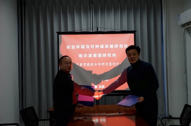 2018年1月29日,我所與院農(nóng)業(yè)環(huán)境與可持續(xù)發(fā)展研究所在北京就獸用納米疫苗合作研發(fā)舉行了簽約儀式。我所副所長(zhǎng)馮力研究員,環(huán)發(fā)所書記郝志強(qiáng)代表雙方簽署了該項(xiàng)協(xié)議。環(huán)發(fā)所崔海信研究員、張亮研究員等與我所蔡雪輝研究員等出席了簽約儀式。