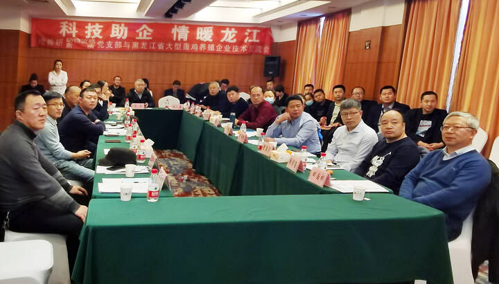 2020年11月15日,動物流感創(chuàng)新團(tuán)隊黨支部和禽病創(chuàng)新團(tuán)隊黨支部的田國彬研究員、高玉龍研究員、劉長軍研究員、韓宗璽研究員、王秀榮研究員、曾顯營副研究員、潘青副研究員一行7人,與哈爾濱益農(nóng)禽業(yè)有限公司等來自哈爾濱、牡丹江、伊春、綏棱、克山、密山等地的10余家大型蛋雞養(yǎng)殖企業(yè)負(fù)責(zé)人共計40余人齊聚哈爾濱,就重要禽病的免疫防控技術(shù)問題進(jìn)行深入交流,探討解決方案。