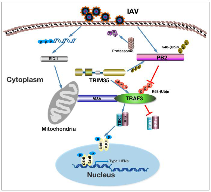 該研究發(fā)現(xiàn),TRIM35是天然免疫維甲酸誘導(dǎo)基因I信號(hào)通路的正調(diào)控分子,可以促進(jìn)I型干擾素的產(chǎn)生。體內(nèi)實(shí)驗(yàn)進(jìn)一步證實(shí),流感病毒在TRIM35基因敲除小鼠體內(nèi)的復(fù)制滴度顯著提高,致病力顯著增強(qiáng)。經(jīng)過(guò)深入研究,進(jìn)一步發(fā)現(xiàn),一方面,TRIM35通過(guò)對(duì)維甲酸誘導(dǎo)基因I信號(hào)通路關(guān)鍵分子TRAF3進(jìn)行泛素化修飾,進(jìn)而促進(jìn)VISA-TBK1復(fù)合物形成和I型干擾素的產(chǎn)生,從而抑制流感病毒復(fù)制。另一方面,流感病毒PB2蛋白能夠通過(guò)抑制TRAF3的泛素化修飾來(lái)抑制I型IFN的產(chǎn)生,但是,TRIM35通過(guò)對(duì)流感病毒PB2蛋白736位點(diǎn)的泛素化修飾導(dǎo)致其降解,從而抑制病毒核糖核蛋白復(fù)合體活性和病毒復(fù)制。