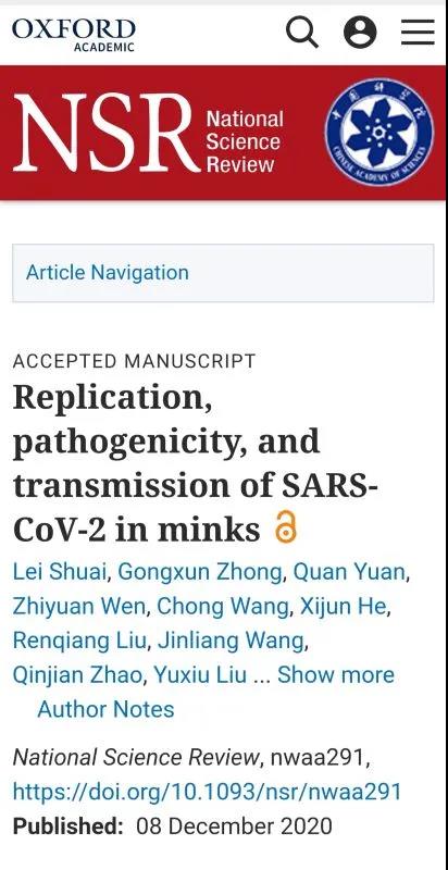 12月8日,《國家科學評論》在線刊出由中國農(nóng)業(yè)科學院哈爾濱獸醫(yī)研究所步志高團隊領銜的研究論文“Replication, pathogenicity, and transmission of SARS-CoV-2 in minks”(新冠病毒在水貂中的復制、致病及傳播能力研究),闡釋了水貂新冠病毒傳播給人類背后的機理。