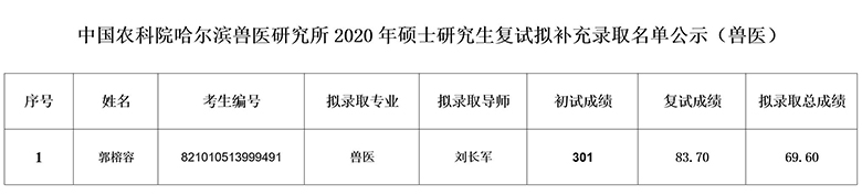 因1名考生因個(gè)人原因放棄錄取,根據(jù)《中國(guó)農(nóng)科院哈爾濱獸醫(yī)研究所2020年碩士研究生復(fù)試工作方案》的規(guī)定,我所擬補(bǔ)充錄取獸醫(yī)專業(yè)碩士1名,現(xiàn)將擬補(bǔ)充錄取學(xué)生名單公示如下,最終錄取以中國(guó)農(nóng)業(yè)科學(xué)院研究生院審核后發(fā)布名單為準(zhǔn)。公示期自6月8日--6月12日,如對(duì)公示名單有異議,可與研究生培養(yǎng)處聯(lián)系。