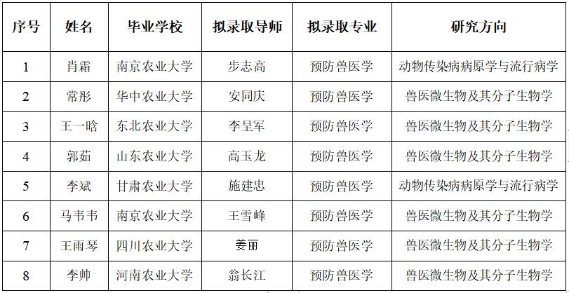 中國農業(yè)科學院哈爾濱獸醫(yī)研究所2021年擬錄取推薦免試研究生名單