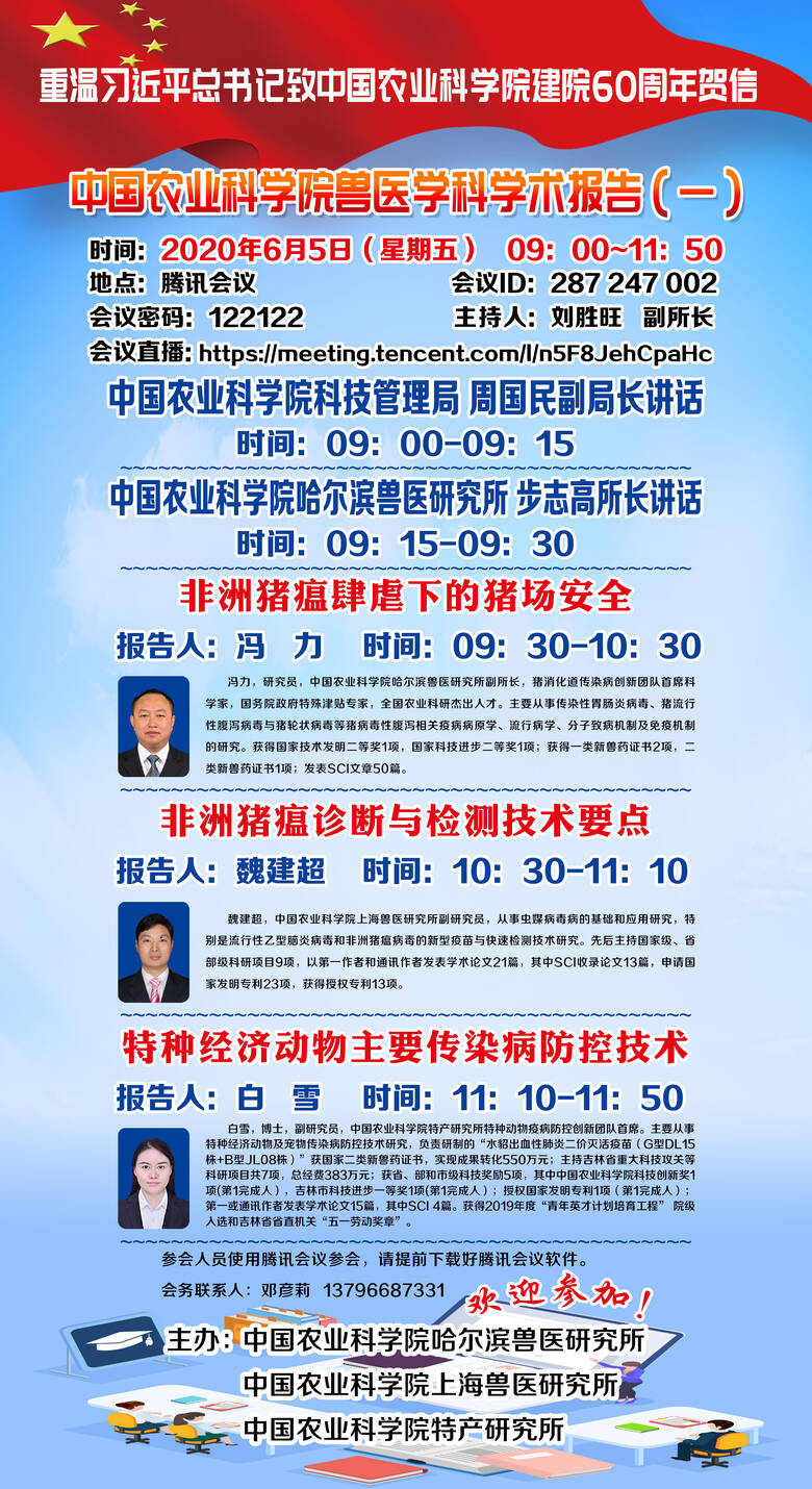 為重溫習(xí)近平總書記致中國農(nóng)業(yè)科學(xué)院建院60周年賀信精神,中國農(nóng)科院將舉辦系列學(xué)術(shù)報(bào)告活動(dòng)。為了避免疫情帶來的影響,獸醫(yī)學(xué)科的學(xué)術(shù)報(bào)告將以線上視頻會(huì)議報(bào)告的形式開展。學(xué)術(shù)報(bào)告會(huì)共分兩次,首次報(bào)告會(huì)將于2020年6月5日 09:00-11:50在騰訊會(huì)議舉行。