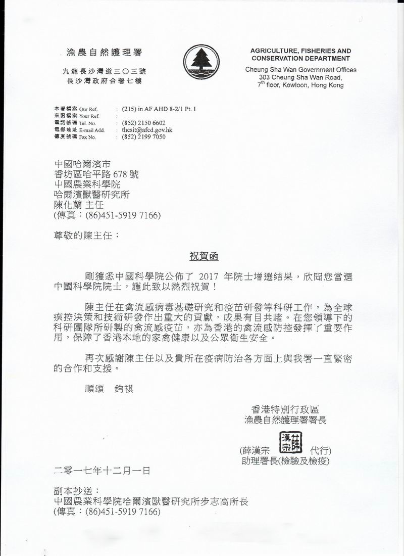 香港漁農(nóng)自然護(hù)理署署長祝賀陳化蘭當(dāng)選中國科學(xué)院院士