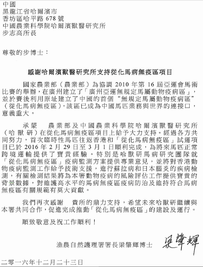 2016年12月23日,香港漁農自然護理署署長梁肇輝博士向所長步志高博士致函,對我所給予廣州亞運無規(guī)定馬屬動物疫病區(qū)的專業(yè)支持表示感謝(附感謝信全文)。