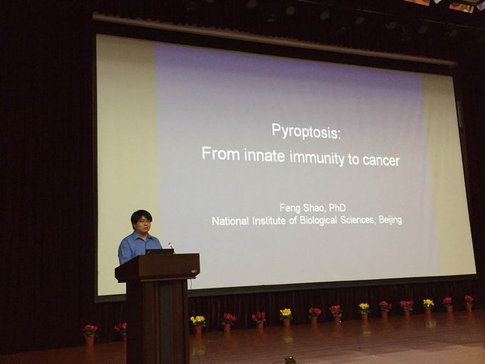 在近100分鐘的演講中,邵峰院士從細(xì)菌感染宿主細(xì)胞后如何被天然免疫系統(tǒng)感知入手,介紹了細(xì)胞內(nèi)三種受體識(shí)別和結(jié)合細(xì)菌脂多糖LPS后激活Caspase-1的過(guò)程,重點(diǎn)闡述了如何鑒定細(xì)胞焦亡過(guò)程的關(guān)鍵蛋白Gasdermin D以及Caspase-1激活后切割Gasdermin D從而導(dǎo)致細(xì)胞焦亡的分子機(jī)制,揭示了細(xì)胞凋亡和細(xì)胞焦亡的區(qū)別和聯(lián)系。此外,邵峰院士還介紹了Gasdermin家族另一成員Gasdermin E在細(xì)胞內(nèi)被Caspase-3切割誘導(dǎo)細(xì)胞焦亡的機(jī)制及其對(duì)癌癥治療的影響和潛在應(yīng)用。