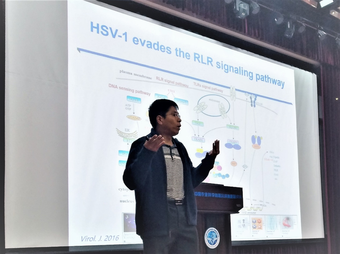一個多小時的演講中,鄭春福教授深入淺出的講解了HSV-1病毒對人類的危害,及HSV-1在逃逸宿主天然免疫的研究進展。報告指出,HSV-1編碼多種蛋白可以拮抗細胞內(nèi)DNA識別受體cGas介導(dǎo)的天然免疫信號通路。鄭春福教授還結(jié)合自身的研究經(jīng)歷,講述了如何通過設(shè)計實驗進行深入、詳實的科學研究,提高科研成果的水平。