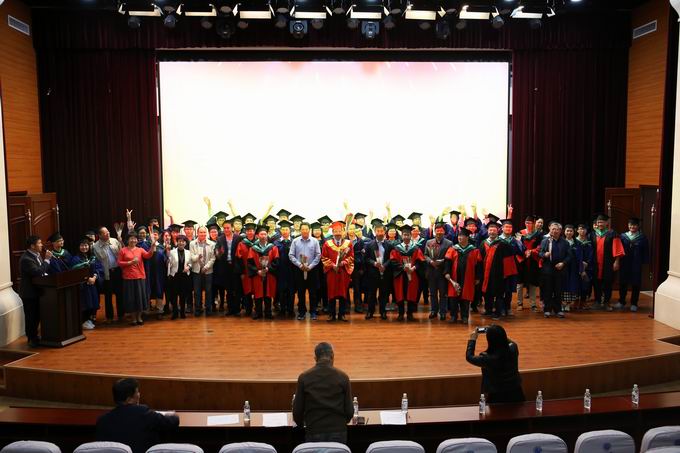 在歡快的樂曲中,59名畢業(yè)生依次踏上主席臺,接受師長的扶正流蘇,宣告大家正式從研究所畢業(yè)。