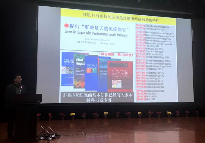 報告會上,田志剛教授介紹了團(tuán)隊(duì)持續(xù)20余年開展肝臟中自然殺傷(NK)細(xì)胞研究進(jìn)展,提出原創(chuàng)性 “肝臟同時是天然免疫器官”的新觀點(diǎn),該觀點(diǎn)已寫入《The Liver》等8本歐美權(quán)威肝臟學(xué)教科書,這一觀點(diǎn)對于傳統(tǒng)免疫理論是一個突破。傳統(tǒng)免疫學(xué)認(rèn)為,肝臟是機(jī)體主要代謝器官,NK細(xì)胞作為天然免疫細(xì)胞不具備免疫記憶功能。