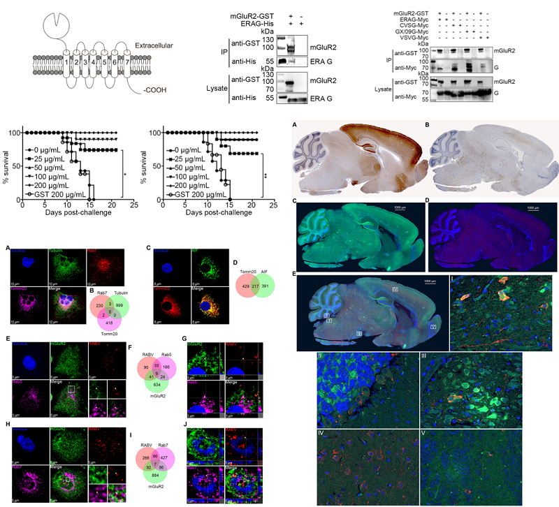 囊膜糖蛋白(G)是介導RABV侵入宿主細胞的主要功能蛋白。該團隊研究發(fā)現(xiàn),mGluR2與G直接相互作用,并與RABV粒子一起內吞,在胞內運輸系統(tǒng)被一同運輸至早期和晚期內吞體。小鼠體內研究表明,mGluR2可溶性蛋白能夠中和RABV街毒的致死攻擊;mGluR2在全腦廣泛性分布,并與RABV抗原呈共定位。結果證明mGluR2是RABV入侵中樞神經系統(tǒng)的關鍵受體。 mGluR2為7次跨膜蛋白,屬于C類G蛋白偶聯(lián)受體(GPCR)家族,廣泛分布于中樞神經系統(tǒng),是興奮性神經遞質谷氨酸的受體分子,其功能紊亂可引起多種神經系統(tǒng)疾病,是精神分裂癥等多種神經系統(tǒng)疾病藥物靶點。 狂犬病是由RABV引起的重要人獸共患病,全球每年因狂犬病致死人數(shù)高達6萬。近年來,我國每年狂犬病報告病死人數(shù)在法定傳染病中始終居前3、4位。RABV專門侵染神經系統(tǒng),人感染后一旦出現(xiàn)神經癥狀,致死率幾乎100%,目前尚無有效治療藥物。RABV感染神經細胞的機制仍不十分明確,尋找決定RABV入侵過程的關鍵宿主蛋白,對闡明其神經致病機制并指導治療藥物研發(fā)具有重要意義。 博士后王金良、博士研究生王子龍、博士后劉任強為本文共同第一作者,溫志遠副研究員和步志高研究員為通訊作者。該研究得到了國家重點研發(fā)計劃和中國農業(yè)科學院創(chuàng)新工程的資助。 (溫志遠 王金良)
