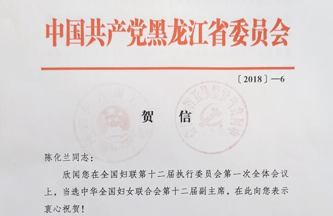 日前,中共黑龍江省委、黑龍江省人民政府給陳化蘭院士發(fā)來賀信,祝賀她當選全國婦聯(lián)副主席。