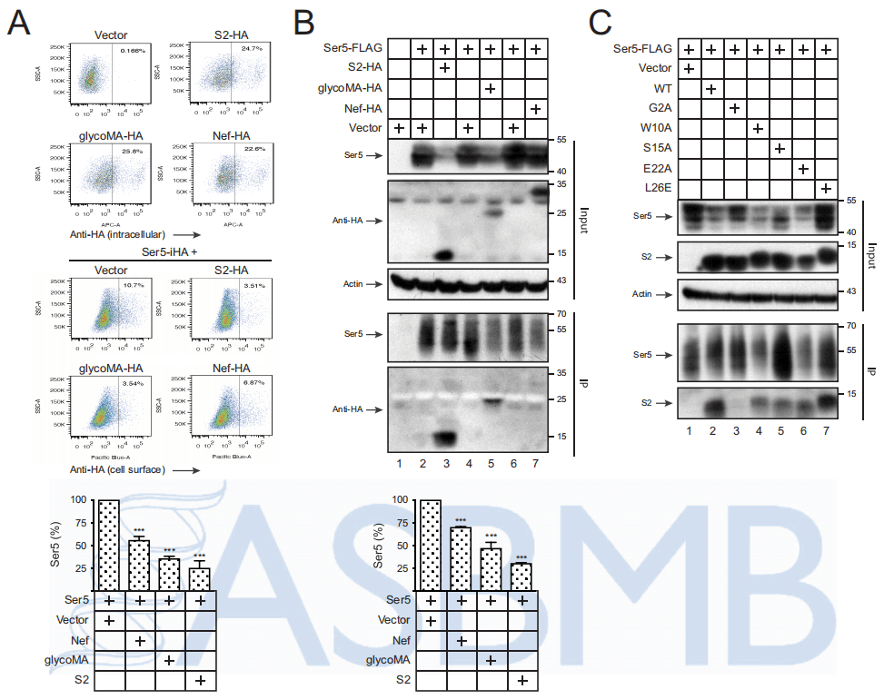 研究人員發(fā)現S2通過受體介導的內吞內化Ser5,并通過早期內吞體、晚期內吞體及溶酶體降解泛素化的Ser5。通過蛋白相互作用檢測發(fā)現S2和Ser5之間的相互作用依賴S2的豆蔻酰化,提示S2-Ser5的相互作用可能發(fā)生在細胞膜上。進一步研究發(fā)現glycoMA與Ser5之間也存在相互作用,但未檢測到Nef-Ser5的相互作用。與Nef相比,S2及glycoMA除了顯著降解Ser5的表達之外,還能降低Ser2以及非洲爪蟾Ser5的表達。此外,盡管馬Ser5(eSer5)的表達比人或者鼠Ser5低,但是eSer5具有顯著的抗病毒活性,并且S2能拮抗eSer5的抗病毒活性。這一研究系統(tǒng)性地說明不同的逆轉錄病毒能利用相似的機制拮抗Ser5的抗病毒活性。