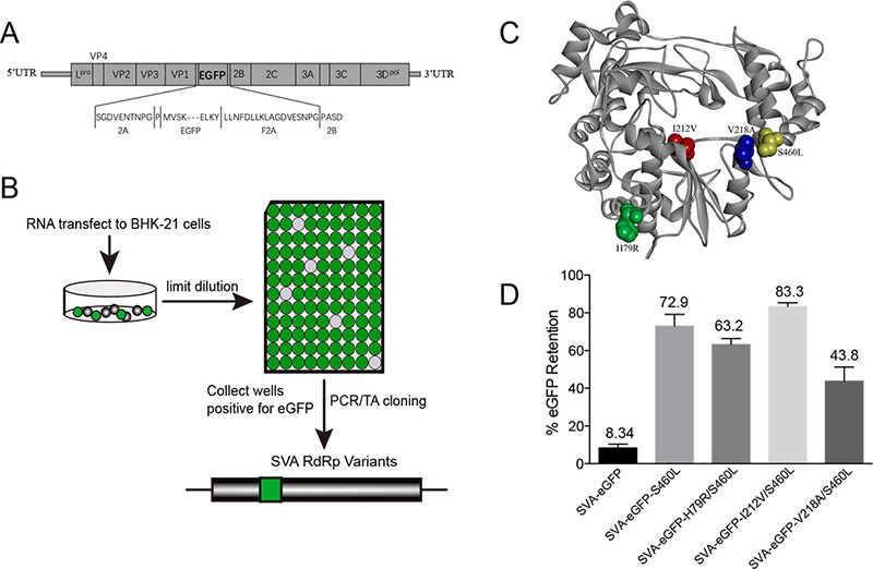 在本研究中,用前期分離的一株塞尼卡病毒SVA/HLJ/CHA/2016(Arch Virol. 2017),建立了該毒株的反向遺傳系統(tǒng),在此基礎(chǔ)上構(gòu)建了SVA報(bào)告病毒。通過(guò)有限稀釋法進(jìn)行篩選,成功獲得兩株SVA的重組缺陷毒株SVA-S460L和SVA-I212V/S460L。用建立的基于細(xì)胞的重組率檢測(cè)系統(tǒng),測(cè)得這兩株突變病毒的重組率較親本病毒分別下降了5.62和31.62倍;高通量測(cè)序分析也顯示,這兩株SVA重組缺陷病毒的變異頻率顯著下降,聚合酶保真性明顯升高。重組缺陷SVA對(duì)抗病毒藥物利巴韋林的作用更敏感,進(jìn)一步證明了重組頻率的下降與聚合酶的保真性密切相關(guān)。