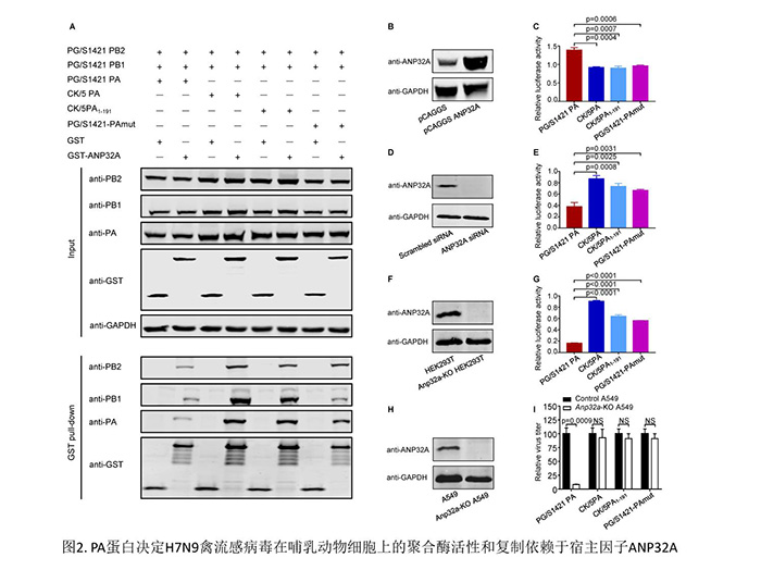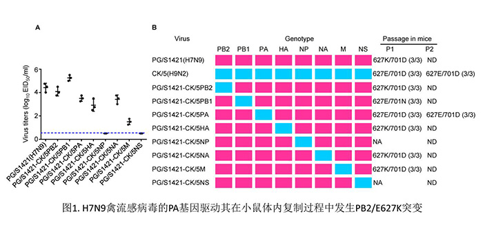 本研究中,陳化蘭院士團(tuán)隊(duì)的李呈軍研究員帶領(lǐng)科研人員在H7N9禽流感病毒背景下構(gòu)建了一系列重組及突變病毒,通過(guò)小鼠感染實(shí)驗(yàn)發(fā)現(xiàn)H7N9禽流感病毒的PA基因是決定其是否發(fā)生PB2/E627K突變的關(guān)鍵基因,進(jìn)一步研究揭示了H7N9禽流感病毒PA蛋白所導(dǎo)致的病毒在哺乳動(dòng)物細(xì)胞上的低聚合酶活性是使其在小鼠體內(nèi)復(fù)制過(guò)程中發(fā)生PB2/E627K突變的內(nèi)在驅(qū)動(dòng)力。另一方面,本研究還發(fā)現(xiàn)H7N9禽流感病毒在哺乳動(dòng)物細(xì)胞上的復(fù)制能力高度依賴(lài)于宿主因子ANP32A蛋白的表達(dá),當(dāng)Anp32a基因在小鼠體內(nèi)被敲除后則使H7N9病毒在復(fù)制過(guò)程中失去了獲得PB2/E627K突變的能力,而采取了另外一種適應(yīng)哺乳動(dòng)物宿主的方式,即獲得PB2/D701N突變。