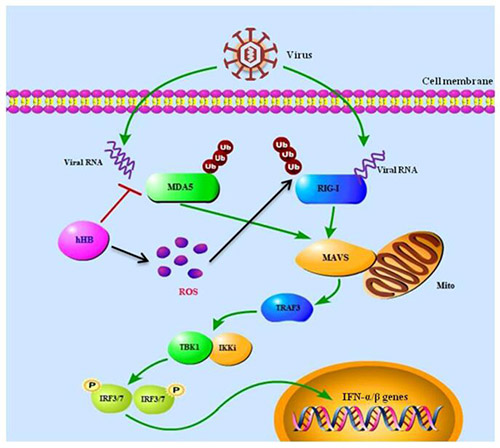 本研究揭示,hHB能通過RIG-I和MDA5介導(dǎo)的信號通路對仙臺(tái)病毒、新城疫病毒、水泡性口炎病毒和腦心肌炎病毒等不同的RNA病毒復(fù)制產(chǎn)生不同的調(diào)節(jié)作用。通過進(jìn)一步探索其相關(guān)調(diào)節(jié)機(jī)制發(fā)現(xiàn),hHB一方面通過直接阻礙MDA5-dsRNA互作來抑制MDA5介導(dǎo)的抗病毒天然免疫反應(yīng)。另一方面,hHB還能以ROS作為中介,通過增強(qiáng)細(xì)胞內(nèi)ROS累積間接促進(jìn)RIG-I發(fā)生K63位的聚泛素化修飾,進(jìn)而增強(qiáng)RIG-I介導(dǎo)的抗病毒天然免疫反應(yīng)。本研究首次證明,hHB是RIG-I/MDA5介導(dǎo)的抗病毒天然免疫反應(yīng)的多效性調(diào)節(jié)因子,全面闡釋了人源血紅蛋白參與天然免疫調(diào)控的分子機(jī)制,揭示了細(xì)胞微環(huán)境中的氧化應(yīng)激水平在抗病毒先天免疫調(diào)節(jié)中的重要性,豐富了分子免疫學(xué)理論。