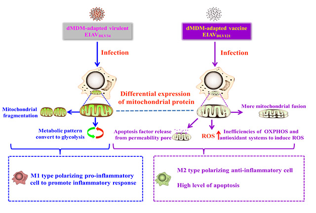 王曉鈞團隊利用比較蛋白質(zhì)組的方法剖析具體機制,發(fā)現(xiàn)EIAV強弱毒感染其靶細胞-巨噬細胞后,總計有447個細胞蛋白發(fā)生差異表達,其中包括73個線粒體相關(guān)蛋白,是所有細胞器中發(fā)生蛋白質(zhì)差異表達最多的。已知線粒體可通過改變代謝模式而影響巨噬細胞的極化改變(促炎或抑炎),以及降低膜通透性引起細胞凋亡。因此,該團隊集中研究了這73個線粒體相關(guān)蛋白及其功能。首先,通過生物信息學(xué)分析發(fā)現(xiàn),這73個蛋白質(zhì)的生物學(xué)功能主要集中在三羧酸循環(huán),氧化還原,ATP合成,NADH脫氫以及氧化磷酸化等。其次,進一步的功能驗證實驗表明,在線粒體相關(guān)蛋白表達水平發(fā)生改變后:1.EIAV弱毒感染細胞的NADH脫氫,氧化磷酸化和ATP生成都受到了抑制,同時,由于低效的氧化磷酸化和抗氧化系統(tǒng)的破壞,導(dǎo)致活性氧的生成過量;2. EIAV弱毒感染細胞的線粒體膜電位下降,通透性增加,線粒體內(nèi)膜中的細胞凋亡因子釋放到細胞質(zhì)中,激活了“內(nèi)源性”細胞凋亡;3. EIAV強毒感染細胞以糖酵解代謝模式為主,細胞轉(zhuǎn)化為M1促炎型,分泌促炎因子,引起炎癥反應(yīng),EIAV弱毒感染細胞以三羧酸循環(huán)為主,并且糖酵解被抑制,細胞轉(zhuǎn)化為M2抑炎型,分泌抑炎因子,抑制炎癥的發(fā)生;4.EIAV強毒感染細胞的線粒體分裂加劇,EIAV弱毒感染細胞的線粒體融合增多。