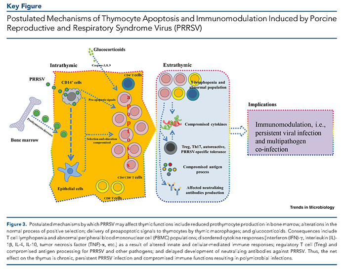 豬免疫抑制病創(chuàng)新團(tuán)隊(duì)自1996年首次分離到中國(guó)第一株P(guān)RRSV毒株CH-1a起,長(zhǎng)期致力于PRRSV流行病學(xué)、致病機(jī)制及疫苗的相關(guān)的研究。2011年,該團(tuán)隊(duì)首次發(fā)現(xiàn)HP-PRRSV感染可以誘導(dǎo)仔豬胸腺萎縮(Vet Immunol Immunolpathol 142, 170-8),隨后對(duì)胸腺內(nèi)細(xì)胞凋亡的具體機(jī)制進(jìn)行了深入探究。在團(tuán)隊(duì)多年對(duì)PRRSV感染誘導(dǎo)的胸腺損傷的研究基礎(chǔ)上,結(jié)合國(guó)內(nèi)外的相關(guān)研究進(jìn)展,本文從豬胸腺發(fā)育及功能、PRRSV對(duì)胸腺的感染及造成的損傷情況、損傷機(jī)制及胸腺損傷導(dǎo)致的機(jī)體先天性免疫及獲得性免疫反應(yīng)異常等方面,綜合分析了PRRSV感染誘導(dǎo)機(jī)體免疫抑制的機(jī)制,闡釋病毒感染后表現(xiàn)出的繼發(fā)感染或混合感染的原因,為PRRSV新疫苗的研究及新型免疫治療制劑的研發(fā)提供了新的思路。該理論研究也對(duì)其他免疫抑制性疾?。℉IV、豬瘟、非洲豬瘟、PCV)等的研究具有重要的指導(dǎo)意義。