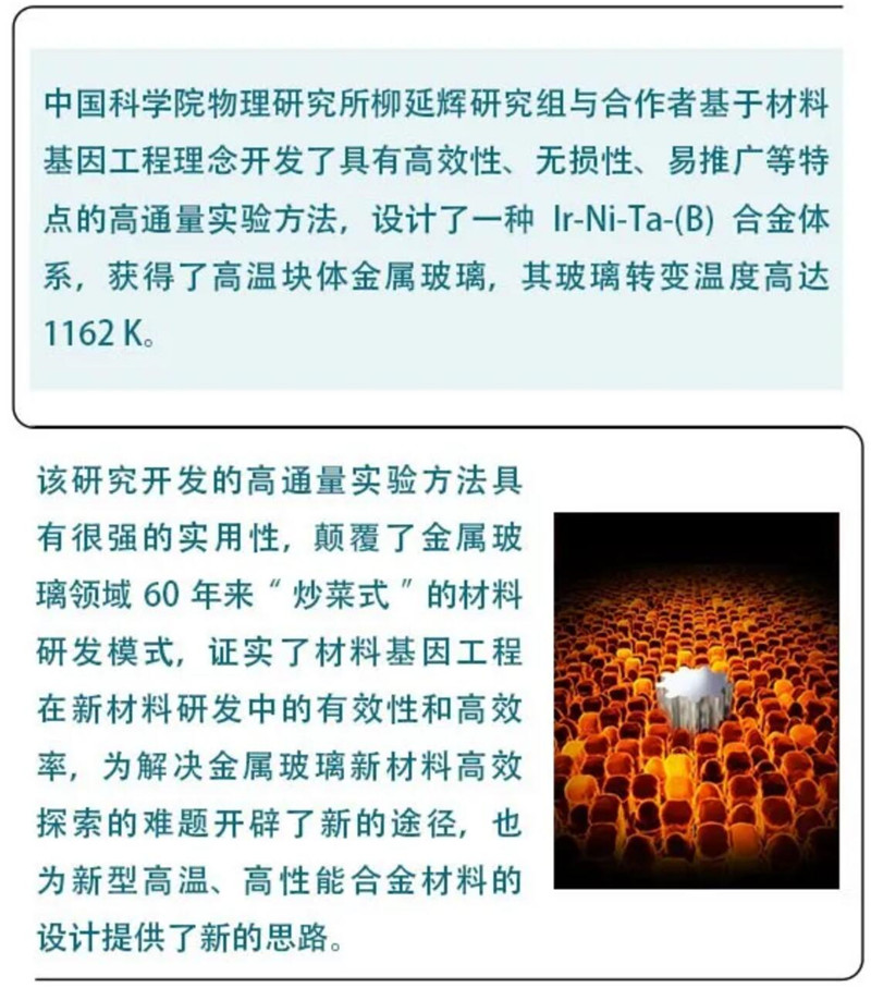 柳延輝研究組基于材料基因工程理念開發(fā)出一種高效、高通量實驗方法,研制出一種具有極高強(qiáng)度和玻璃形成能力的高溫塊體金屬玻璃合金,為解決金屬玻璃新材料高效探索的難題開辟了新的途徑。