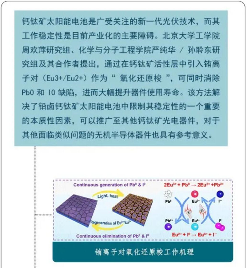 周歡萍、嚴(yán)純?nèi)A研究組在鈣鈦礦太陽能電池中創(chuàng)造性引入銪離子對,通過氧化還原反應(yīng)循環(huán)消除了鉛鹵鈣鈦礦中的本質(zhì)性缺陷,大幅提升了太陽能電池的使用壽命和穩(wěn)定性。