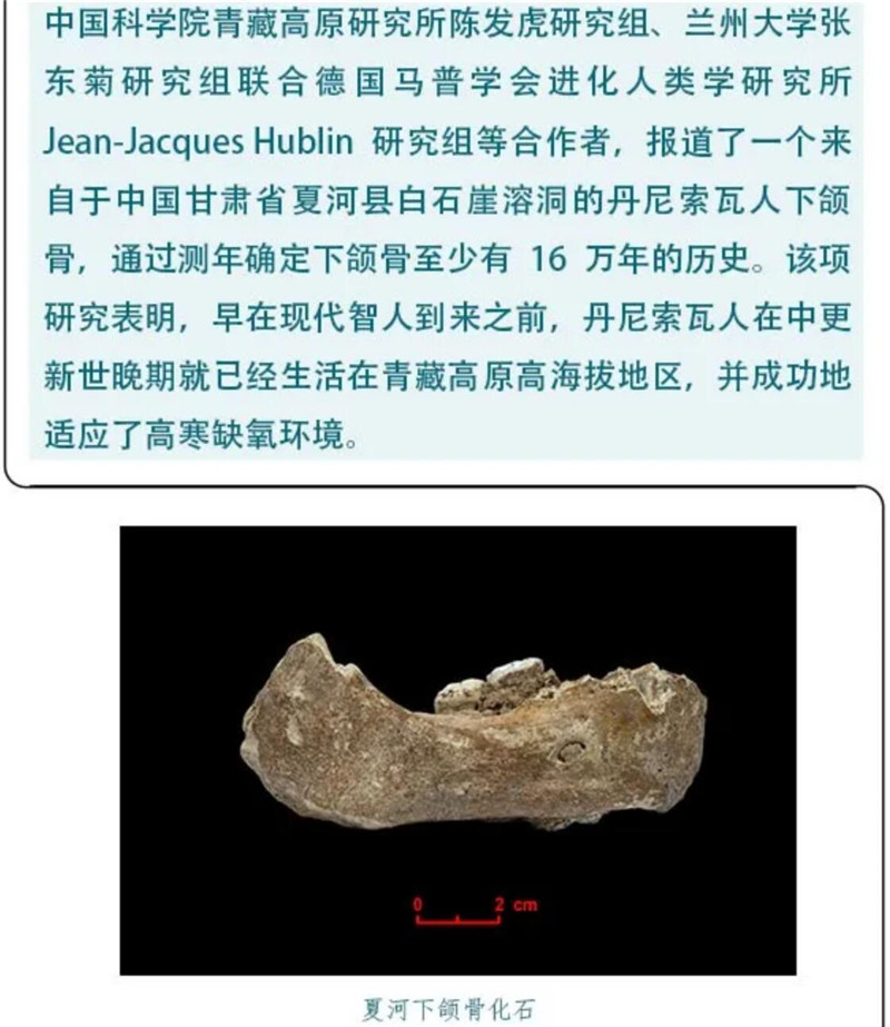 陳發(fā)虎、張冬菊等研究組鑒定發(fā)現(xiàn)青藏高原邊緣的一塊人類下頜骨化石屬于16萬年前的丹尼索瓦人,表明早在現(xiàn)代智人到來之前,丹尼索瓦人就已經(jīng)生活在青藏高原,并成功地適應(yīng)了高寒缺氧環(huán)境。