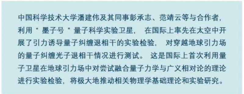 潘建偉研究組利用“墨子號”量子科學(xué)實驗衛(wèi)星,展開引力誘導(dǎo)量子糾纏退相干實驗,首次實現(xiàn)對嘗試將量子力學(xué)和廣義相對論融合的理論進(jìn)行了實驗檢驗。