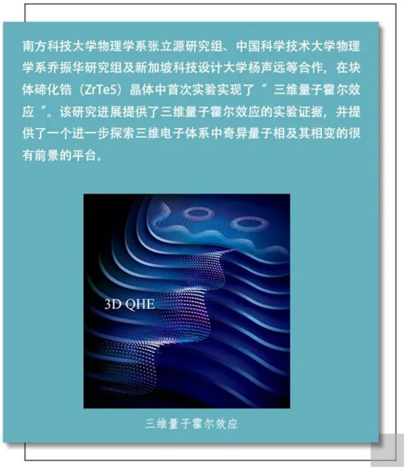 張立源和喬振華等研究組首次在塊體碲化鋯材料上觀測到三維量子霍爾效應(yīng),并指出該量子化現(xiàn)象可能由磁場下相互作用產(chǎn)生的電荷密度波誘導(dǎo),補(bǔ)全了量子霍爾效應(yīng)家族的一個重要拼圖。