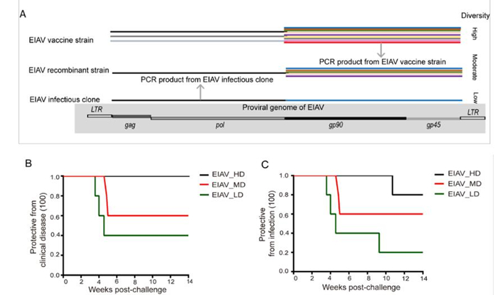 近日,中國農(nóng)業(yè)科學(xué)院哈爾濱獸醫(yī)研究所獸醫(yī)生物技術(shù)國家重點(diǎn)實(shí)驗(yàn)室王曉鈞團(tuán)隊(duì),首次證實(shí)了馬傳染性貧血病毒(EIAV)病毒囊膜蛋白(env)的多樣性組成是馬傳貧病毒弱毒疫苗能夠誘導(dǎo)免疫保護(hù)的關(guān)鍵因素。相關(guān)研究成果以“Env diversity-dependent protection of the attenuated equine infectious anemia virus vaccine ”為題于2020年6月11日發(fā)表在國際病原學(xué)專業(yè)學(xué)術(shù)期刊《新發(fā)微生物與感染(Emerging Microbes & Infections)》。
