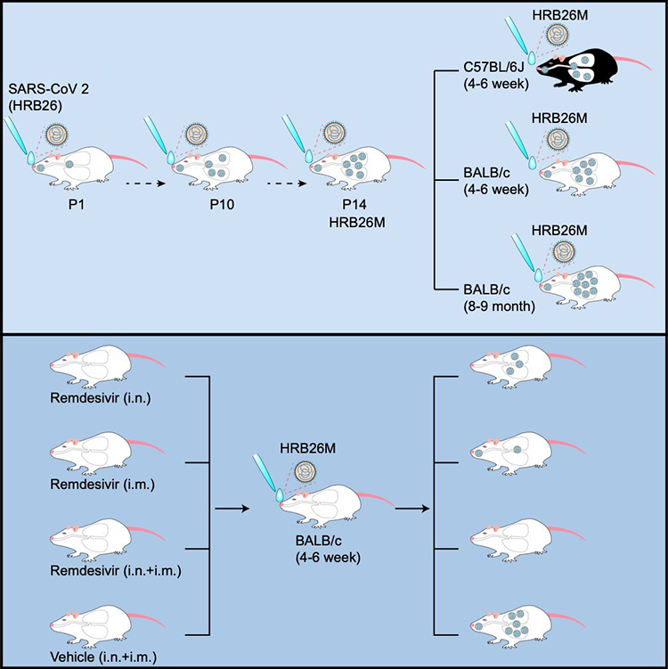 該團(tuán)隊(duì)成員利用臨床樣品中分離的SARS-CoV-2病毒株(SARS-CoV-2/HRB26/human/2020/CHN (HRB26)),通過(guò)鼻腔途徑感染4-6周齡BALB/c小鼠,快速傳代14代,獲得一株小鼠適應(yīng)的SARS-CoV-2(HRB26M),其小鼠半數(shù)感染劑量(MID50)為1.4 PFU。HRB26M分別鼻腔感染4-6周齡BALB/c小鼠、4-6周齡C57BL/6J小鼠和8-9月齡BALB/c小鼠,感染后第3天和5天鼻甲和肺臟均檢測(cè)到高水平的病毒感染復(fù)制,并且在8-9月齡BALB/c小鼠引起典型的肺炎病變。比較HRB26和HRB26M基因組,小鼠適應(yīng)導(dǎo)致3處非同義突變和一處缺失,分別為nsp8蛋白 A81T,S蛋白Q498H和N969S,以及S蛋白中臨近裂解位點(diǎn)的 675-679位(QTQTN)缺失。同時(shí),體外病毒感染細(xì)胞抑制試驗(yàn)證實(shí),小鼠適應(yīng)突變沒(méi)有改變病毒對(duì)抗病毒藥物瑞德西韋(Remdesivir)的敏感性。