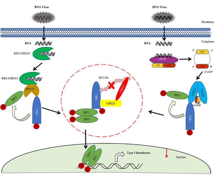 本研究通過篩選發(fā)現(xiàn)泛素結(jié)合酶UBE2S是天然免疫信號通路的重要負調(diào)控因子。UBE2S能夠抑制DNA病毒和RNA病毒感染介導(dǎo)的I型干擾素的產(chǎn)生。深入研究發(fā)現(xiàn)UBE2S通過招募去泛素化酶USP15抑制干擾素信號通路中的關(guān)鍵激酶TBK1的K63泛素化,從而抑制TBK1對下游轉(zhuǎn)錄因子IRF3的磷酸化激活,最終抑制I型干擾素的產(chǎn)生。本研究豐富了泛素化修飾參與I型干擾素產(chǎn)生的調(diào)控網(wǎng)絡(luò),對于理解機體抗病毒天然免疫的過程具有重要意義。