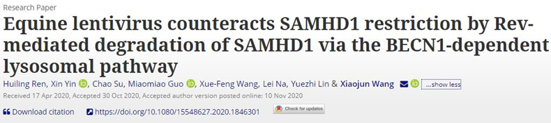 近日,中國農(nóng)業(yè)科學(xué)院哈爾濱獸醫(yī)研究所王曉鈞團(tuán)隊(duì),在馬的慢病毒——馬傳染性貧血病毒(EIAV)拮抗髓系細(xì)胞中關(guān)鍵天然免疫限制因子SAMHD1的機(jī)制研究方面取得重要進(jìn)展。相關(guān)研究結(jié)果以“Equine lentivirus counteracts SAMHD1 restriction by Rev-mediated degradation of SAMHD1 via the BECN1-dependent lysosomal pathway”為題,于11月10日在線發(fā)表在國際學(xué)術(shù)期刊《自噬 (Autophagy)》上。該研究首次發(fā)現(xiàn)馬SAMHD1(EfSAMHD1)通過抑制EIAV的反轉(zhuǎn)錄來限制EIAV的復(fù)制,但其抗病毒活性可以被EIAV的病毒蛋白表達(dá)調(diào)控因子(Rev)所拮抗, 揭示了EIAV Rev通過依賴于Beclin1(BECN1)和PIK3C3,但不依賴于經(jīng)典自噬的溶酶體途徑降解EfSAMHD1,進(jìn)而實(shí)現(xiàn)逃逸天然免疫限制的分子機(jī)制。