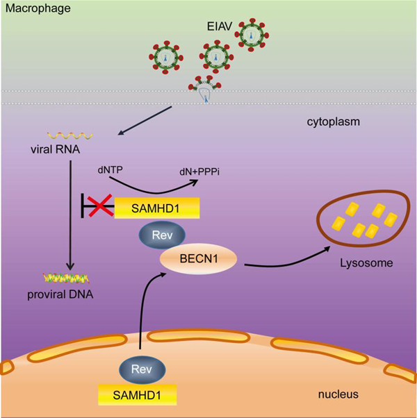 該研究首次證實(shí)了馬SAMHD1(EfSAMHD1)通過抑制EIAV的反轉(zhuǎn)錄階段來限制病毒復(fù)制,EfSAMHD1的dNTPase活性對(duì)其抗病毒功能是必需的。而EIAV感染可以下調(diào)EfSAMHD1的蛋白表達(dá),進(jìn)一步篩選發(fā)現(xiàn),EIAV編碼的附屬蛋白R(shí)ev具有下調(diào)EfSAMHD1表達(dá)的功能, EIAV Rev可與EfSAMHD1相互作用,將EfSAMHD1從細(xì)胞核重新定位至細(xì)胞漿,通過溶酶體途徑降解EfSAMHD1。對(duì)其降解機(jī)制深入探索發(fā)現(xiàn),EIAV Rev通過依賴于BECN1和PIK3C3,但不依賴于經(jīng)典自噬的溶酶體途徑降解EfSAMHD1。EIAV Rev是和其它慢病毒Rev的功能一樣,在介導(dǎo)未完全剪接的病毒RNA出核方面發(fā)揮關(guān)鍵作用,本研究首次揭示了EIAV Rev的第二種功能,其具有結(jié)合BECN1和拮抗EfSAMHD1的功能,且這種功能與Rev的核輸出活性相關(guān),并依賴于Rev的非必需區(qū)。此外,該研究還發(fā)現(xiàn)Rev降解SAMHD1具有種屬特異性。該研究揭示了EIAV Rev在EIAV逃逸宿主天然免疫中的作用,這種兼顧RNA輸出和抵抗天然免疫的雙重功能并未在其它慢病毒中被發(fā)現(xiàn),說明馬SAMHD1與慢病毒之間存在一種獨(dú)特的共進(jìn)化途徑。