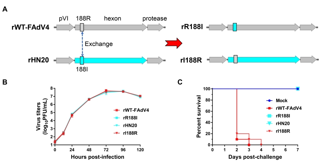該研究中,研究者首先利用Fosmid系統(tǒng)建立了FAdV-4的反向遺傳操作技術(shù),利用該技術(shù)對(duì)病毒基因組骨架進(jìn)行基因替換和點(diǎn)突變?;蛱鎿Q結(jié)果證實(shí),Hexon基因是決定新型FAdV-4高致病性的關(guān)鍵基因;進(jìn)一步利用點(diǎn)突變對(duì)強(qiáng)弱毒Hexon基因的13個(gè)氨基酸差異位點(diǎn)進(jìn)行突變,證實(shí)Hexon第188位氨基酸對(duì)病毒毒力起到?jīng)Q定性作用(圖1)。將高致病性的野生型FAdV-4 Hexon第188位氨基酸由R突變?yōu)镮的重組毒rR188I完全喪失對(duì)SPF雞的致病性,而將無致病性的rHN20 Hexon第188位氨基酸由I突變?yōu)镽,則重組毒rI188R恢復(fù)對(duì)SPF雞100%的致死率。