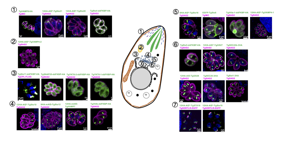 本研究揭示了弓形蟲中一系列具有重要功能的SNARE家族蛋白,包括:協(xié)調內質網(wǎng)的獨特的Qc-SNARE(TgStx19);TgGS27(Qb)對高爾基體的生物發(fā)生至關重要; TgStx10 (Qc), TgStx12(Qa)和TgVAMP4-1(R)駐留于細胞內體樣間室,影響蟲體的入侵和逸出能力。最重要的是,本研究發(fā)現(xiàn)了一個定位于弓形蟲頂質體最外層膜的R-SNARE (TgVAMP4-2),條件敲除TgVAMP4-2可阻斷核編碼頂質體蛋白進入頂質體內。研究揭示了SNARE蛋白在真核生物內共生細胞器囊泡運輸過程中發(fā)揮作用的關鍵分子機制,對理解內共生細胞器生物發(fā)生的分子機制和弓形蟲藥物的開發(fā)具有重要意義。