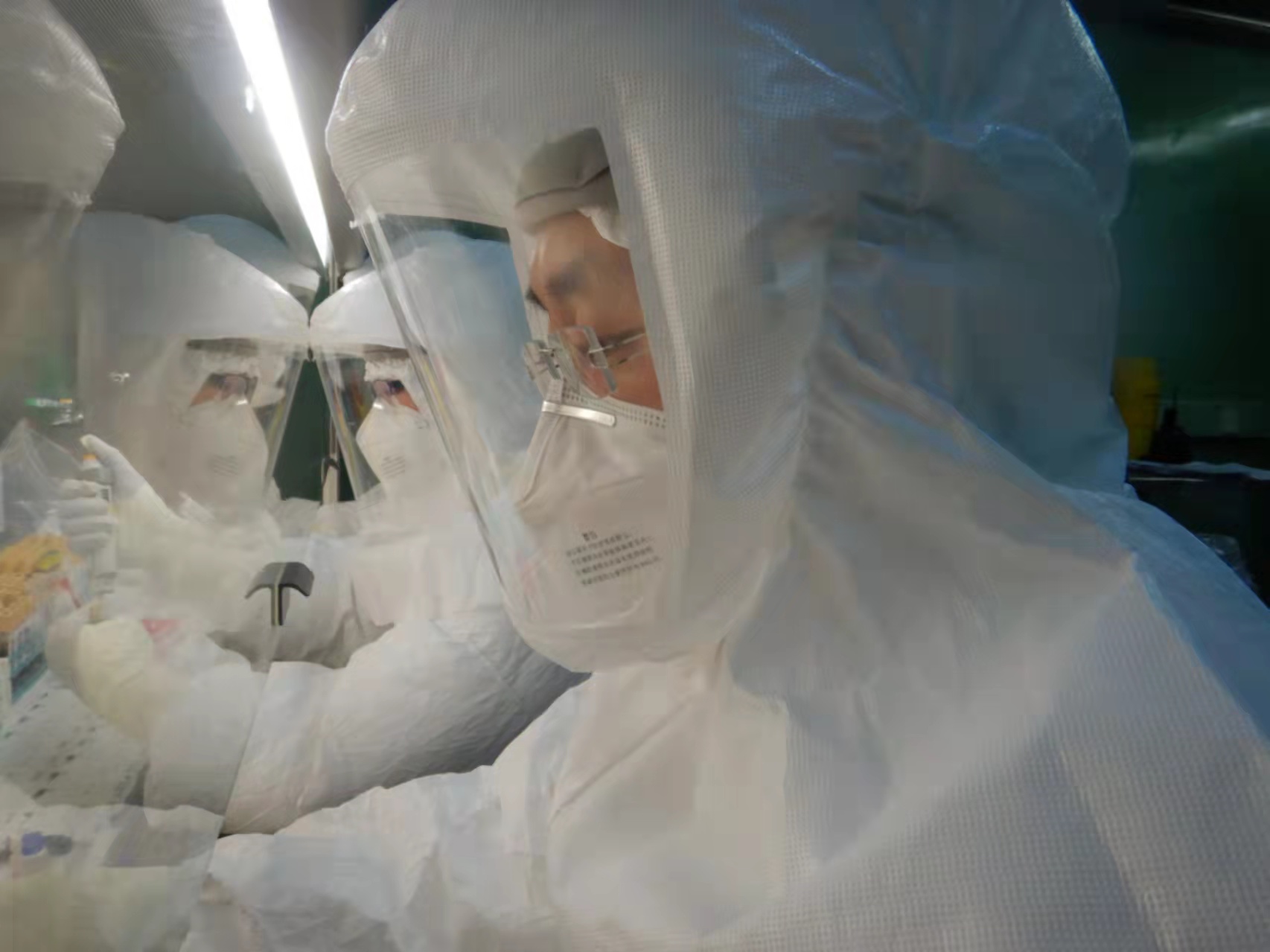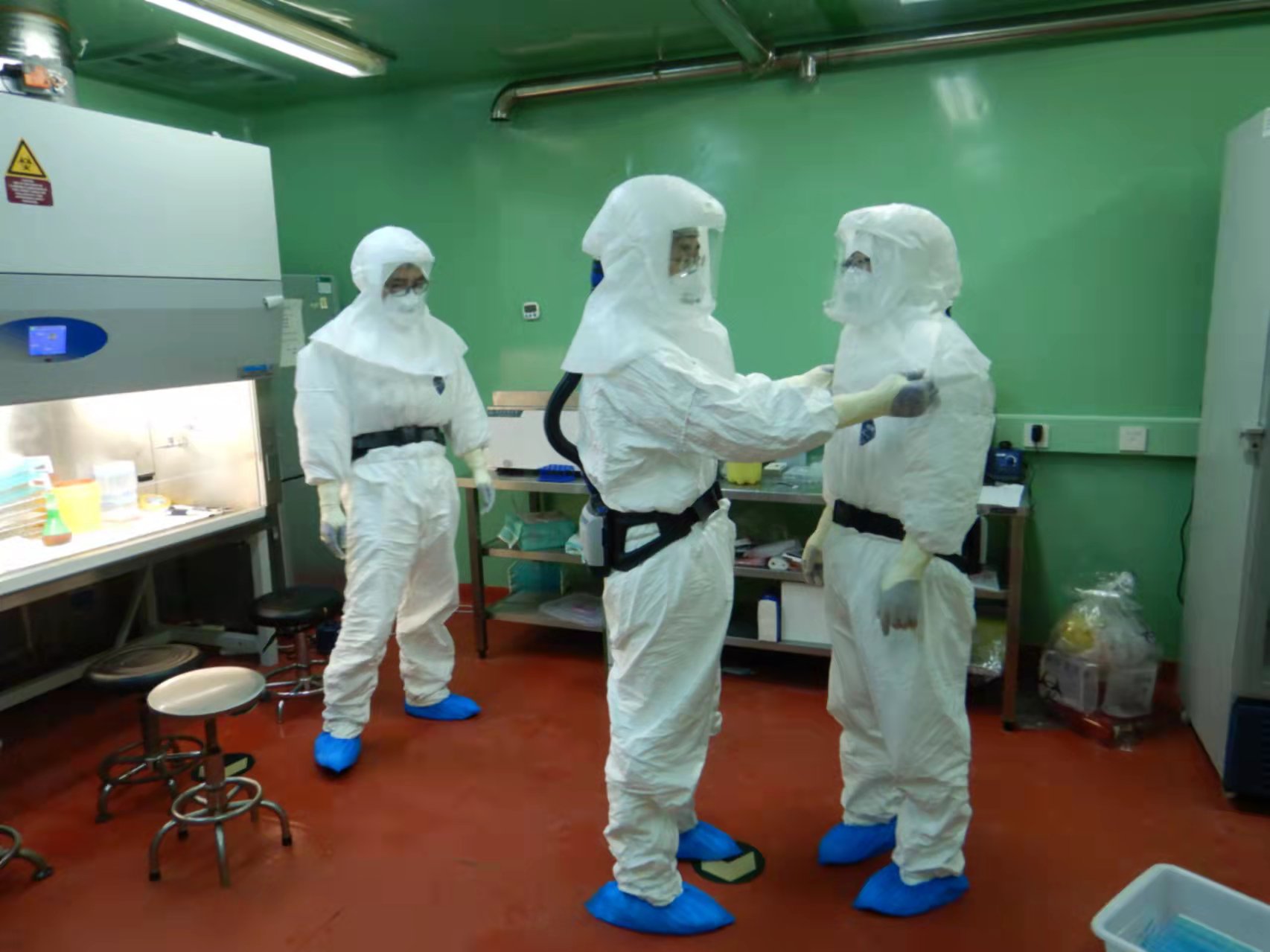 P3實(shí)驗(yàn)室進(jìn)出淋浴更衣比較費(fèi)時(shí),檢測人員為了節(jié)約時(shí)間,進(jìn)入實(shí)驗(yàn)室前都不喝水,以避免上廁所,經(jīng)常連續(xù)工作七八個(gè)小時(shí),滴水不進(jìn)。在負(fù)壓環(huán)境中,他們身穿厚重的防護(hù)服,衣服常常被汗水浸透,鼻梁也被口罩勒傷。為了保證進(jìn)度,大家舍不得休息,每次都是處理完手里所有樣品再出來吃飯,而那時(shí)飯菜早已冰涼,有的人為了搶時(shí)間,兩餐合一了。