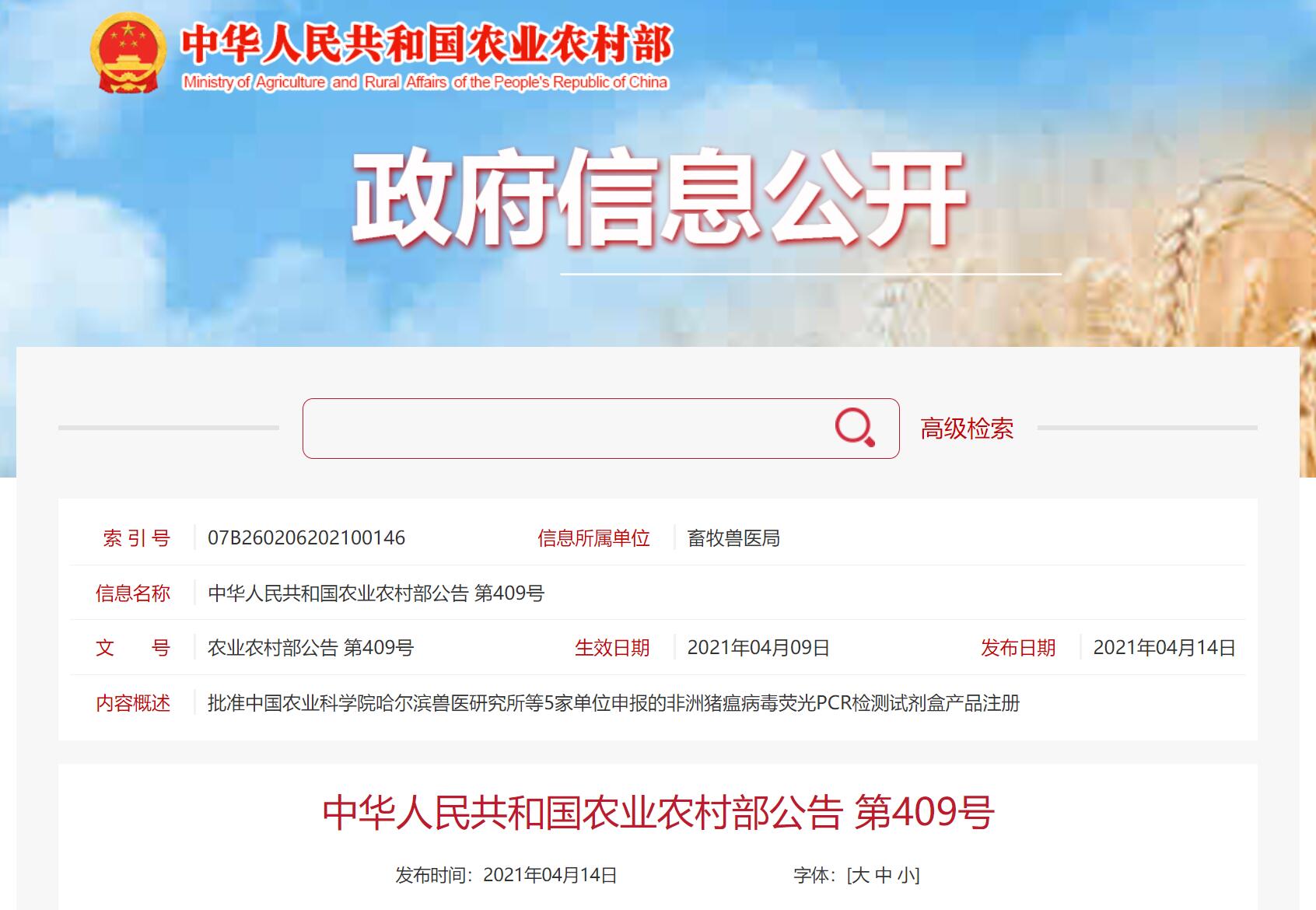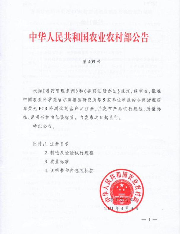 據(jù)農(nóng)業(yè)農(nóng)村部發(fā)布的第409號(hào)公告獲悉,由中國(guó)農(nóng)業(yè)科學(xué)院哈爾濱獸醫(yī)研究所豬烈性傳染病創(chuàng)新團(tuán)隊(duì)聯(lián)合哈爾濱國(guó)生生物科技股份有限公司等4家單位申報(bào)的非洲豬瘟病毒熒光PCR檢測(cè)試劑盒,獲得國(guó)家獸藥產(chǎn)品注冊(cè)批準(zhǔn)。該試劑盒也是哈爾濱獸醫(yī)研究所獲批的首個(gè)非洲豬瘟診斷制品。