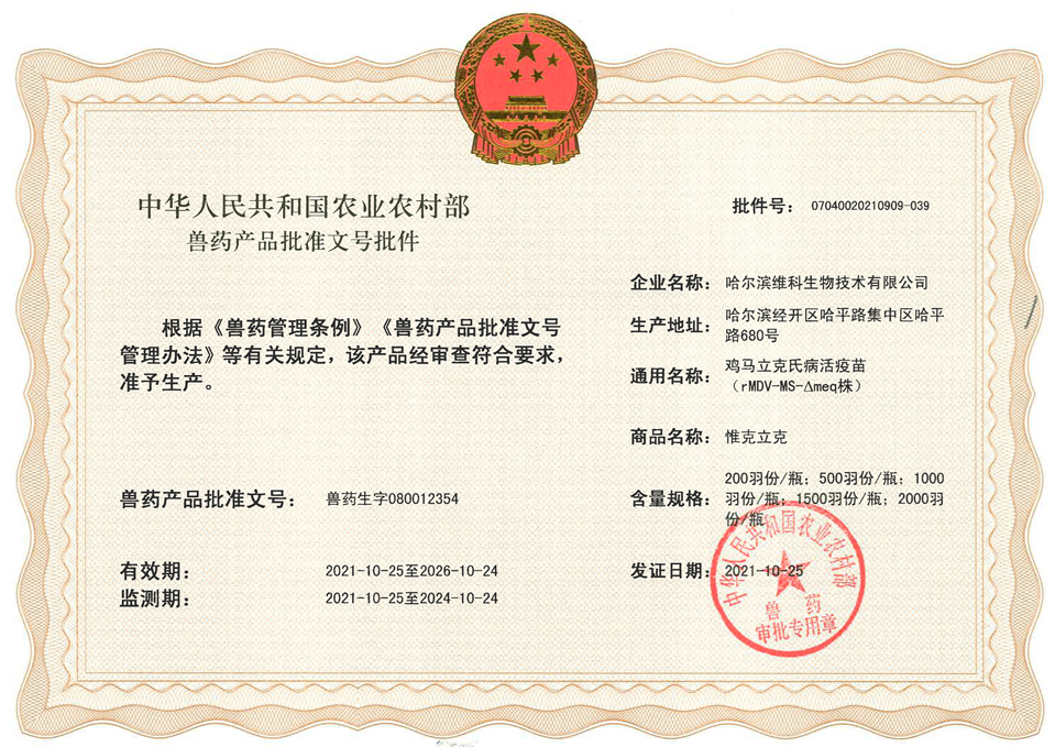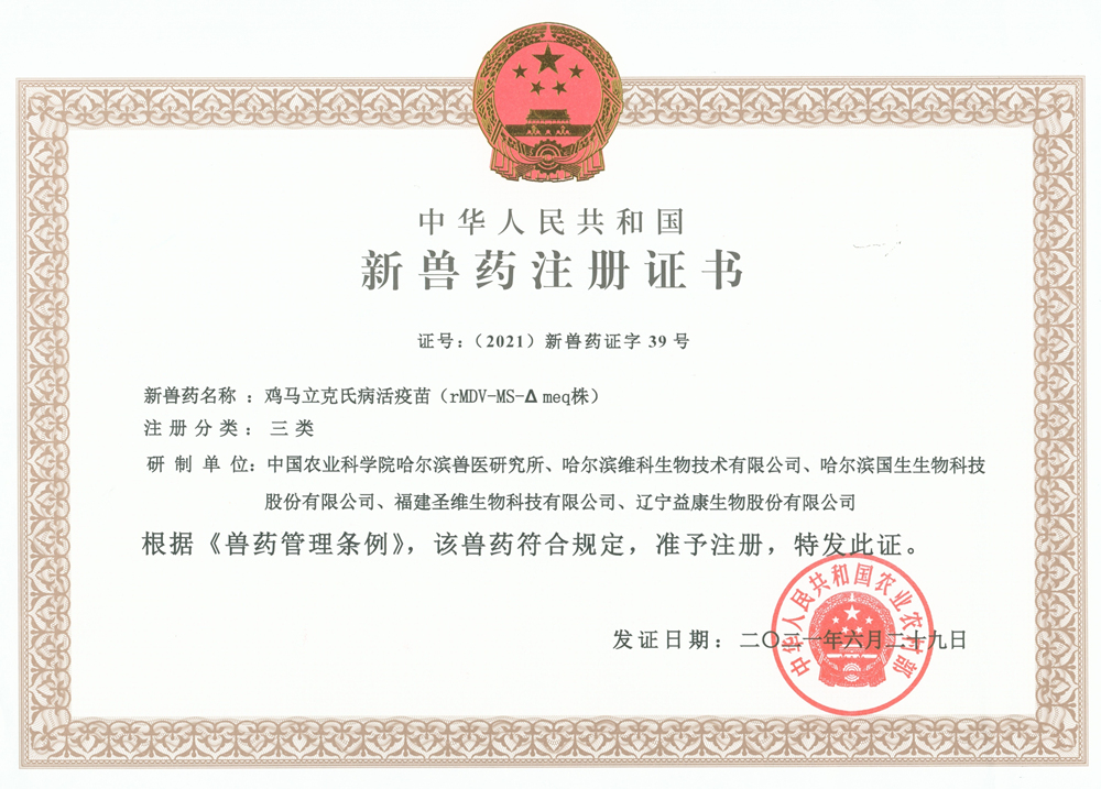 2021年6月30日農(nóng)業(yè)農(nóng)村部發(fā)布第441號公告,由中國農(nóng)業(yè)科學院哈爾濱獸醫(yī)研究所禽免疫抑制病創(chuàng)新團隊劉長軍研究員主持研制的“雞馬立克氏病活疫苗(rMDV-MS-△meq株)”,獲得國家新獸藥注冊證書[(2021)新獸藥證字39號]。