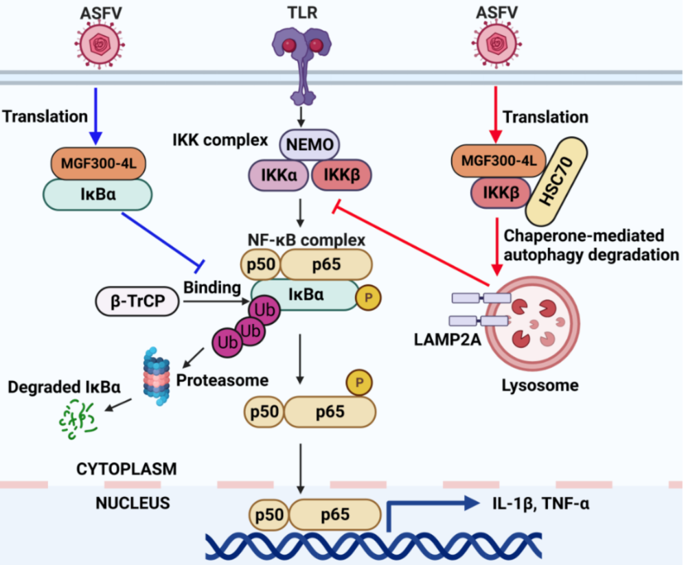 目前對于ASFV毒力相關(guān)因子及其作用機制的了解十分有限,制約了安全、有效疫苗的研發(fā)。豬烈性傳染病創(chuàng)新團隊前期研究提示,多基因家族基因(MGFs)與ASFV的致病性和其在靶細胞豬肺泡巨噬細胞(PAMs)中的復制密切相關(guān)。為探究調(diào)控ASFV在PAMs中復制的關(guān)鍵MGFs,研究人員創(chuàng)新性地采用MGFs大片段與單個基因缺失相結(jié)合的策略,成功鑒定出MGF300家族基因(1L、2R和4L)為ASFV在PAMs中復制降低的關(guān)鍵基因。進一步研究發(fā)現(xiàn),MGF300-2R可招募自噬受體TOLLIP并通過選擇性自噬降解IKKα和IKKβ,進而抑制NF-κB信號通路調(diào)控的炎性細胞因子IL-1β和TNF-α的產(chǎn)生,從而影響ASFV的致病性,表明其為ASFV的毒力相關(guān)因子(Wang et al., PLoS Pathogens, 2023)。