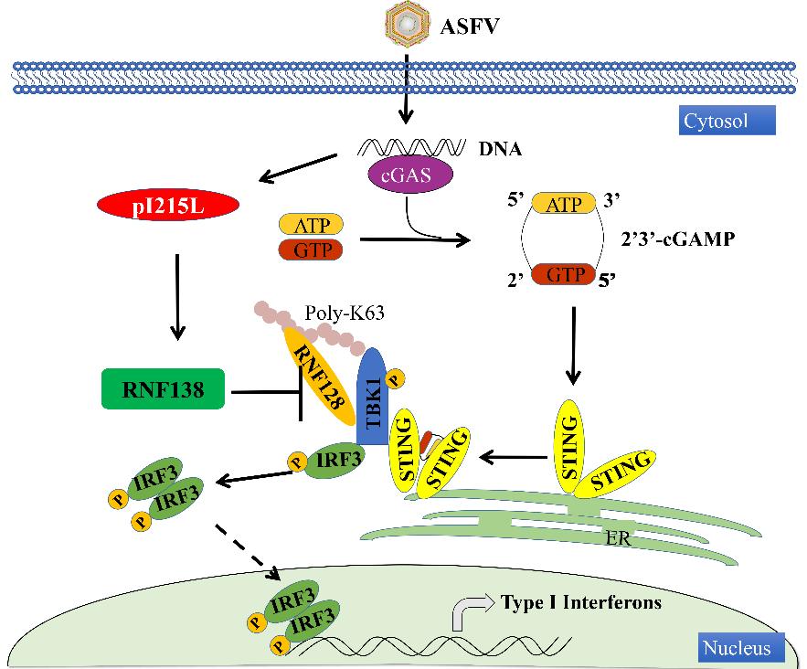 非洲豬瘟病毒免疫逃逸機制與病毒的致病力和抗病毒豬的遺傳育種密切相關。2021年11月10日,哈爾濱獸醫(yī)研究所在非洲豬瘟病毒免疫逃逸機制研究上取得新進展,研究成果以 “African swine fever virus pI215L negatively regulates cGAS-STING signaling pathway through recruiting RNF138 to inhibit K63-linked ubiquitination of TBK1”為題,發(fā)表在《Journal of Immunology》雜志上,并被主編推薦為Top Read文章。該研究發(fā)現(xiàn)非洲豬瘟病毒編碼的pI215L蛋白能夠抑制Ⅰ型干擾素的產(chǎn)生,并闡明了該蛋白抑制Ⅰ型干擾素產(chǎn)生的分子機制。