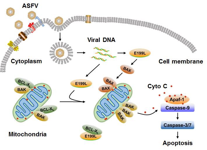 ASFV感染豬后,臨床特征表現(xiàn)為感染的組織內(nèi)大量細胞死亡以及淋巴細胞枯竭,然而該病毒感染引起細胞死亡的分子機制目前仍不清楚。研究人員從ASFV編碼的94個蛋白中篩選并鑒定出4個病毒蛋白能夠引起細胞死,其中pE199L的作用最為顯著。體外實驗結(jié)果表明,在豬源細胞(CRL-2843)和人源細胞(HEK293T和HeLa)中,異源表達的pE199L可顯著誘導細胞死亡,并且表現(xiàn)出明顯的細胞凋亡特征,包括核皺縮、核DNA片段化、凋亡小體形成等。而在ASFV感染過程中,下調(diào)pE199L的表達可明顯降低細胞的死亡。另外,pE199L的表達導致線粒體膜電位勢能下降,細胞色素C釋放以及凋亡相關激酶caspase-9和-3/7的激活,說明pE199L通過線粒體凋亡途徑誘導細胞死亡。