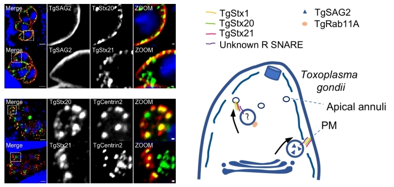 本研究發(fā)現(xiàn)了定位在弓形蟲頂環(huán)結(jié)構(gòu)及質(zhì)膜上的SNARE蛋白TgStx20、TgStx21與保守的TgStx1相互作用。利用AID條件性敲除系統(tǒng),證明該復(fù)合物介導(dǎo)TgRab11A參與的靶向頂環(huán)的囊泡運(yùn)輸以及蛋白外泌過(guò)程。TgStx20和TgStx21是首次發(fā)現(xiàn)的定位在頂環(huán)結(jié)構(gòu)的膜蛋白。頂環(huán)結(jié)構(gòu)上存在SNARE蛋白也證明了頂環(huán)不可能是先前認(rèn)為的孔狀結(jié)構(gòu),而可能是封閉膜結(jié)構(gòu)的一部分或者構(gòu)成一種封閉的區(qū)室。