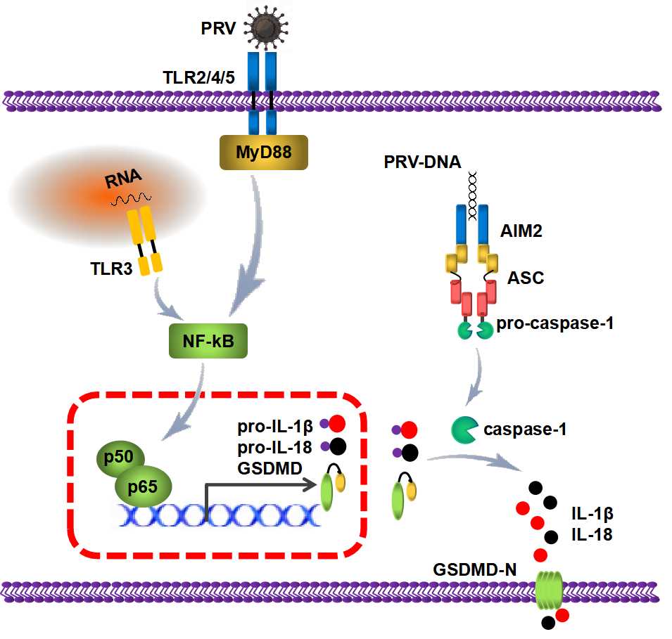 炎癥反應(yīng)是宿主重要的抗病毒免疫反應(yīng)之一,抗病毒炎性因子的轉(zhuǎn)錄、成熟和分泌受到三個信號的調(diào)控。研究發(fā)現(xiàn)PRV感染小鼠腹腔巨噬細胞后通過激活多個Toll樣受體,促使NF-κB入核,促進白細胞介素等炎性因子的轉(zhuǎn)錄與表達。通過構(gòu)建多種基因敲除小鼠感染模型,發(fā)現(xiàn)PRV感染可激活A(yù)IM2炎癥小體,從而促使IL-1β和IL-18的成熟。進一步研究發(fā)現(xiàn),PRV感染還可以誘導(dǎo)GSDMD的上調(diào)表達,活化的GSDMD促進炎性因子分泌到細胞外。因此,本研究揭示了在PRV感染后會激活以上三個信號來誘導(dǎo)具有生物活性的炎癥因子的分泌,從而抑制PRV增殖的分子機制,在宿主抵抗PRV感染過程中發(fā)揮了重要作用。