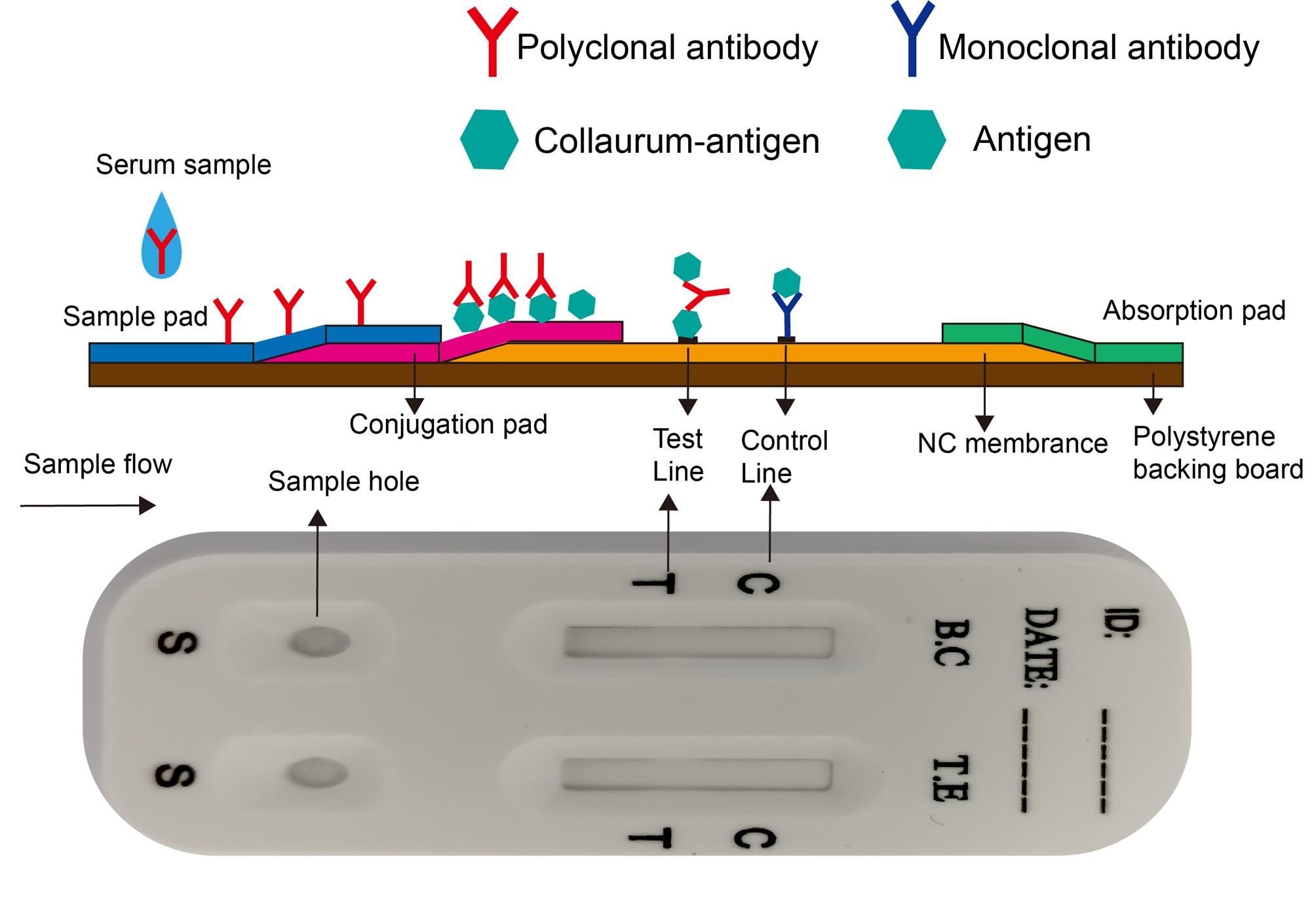 國內(nèi)外針對馬梨形蟲血清學(xué)抗體檢測使用較為普遍的是競爭ELISA方法,前期,馬傳染病與慢病毒病團(tuán)隊(duì)也獨(dú)立研制成功了馬梨形蟲抗體檢測的競爭ELISA試劑盒,該方法具有特異性強(qiáng)的優(yōu)點(diǎn),但是因?yàn)閷x器和操作人員的要求相對較高,在實(shí)際田間尤其是條件相對落后的地區(qū)應(yīng)用時(shí),面臨著相對較大的挑戰(zhàn)。膠體金技術(shù)是快速、簡便的檢測方法,針對各種動物傳染病的膠體金技術(shù)已成功應(yīng)用。團(tuán)隊(duì)分別選取馬梨形蟲兩種病原免疫原性較高的診斷抗原,制備了對應(yīng)的單克隆抗體,利用雙抗原夾心的技術(shù)原理,成功建立了可同時(shí)檢測馬梨形蟲兩種病原抗體的膠體金檢測卡,15分鐘內(nèi),通過一滴血可快速檢測馬梨形蟲抗體情況,具有快速、有效和準(zhǔn)確的優(yōu)點(diǎn)。相關(guān)研究結(jié)果以 “Development of a Test Card Based on Colloidal Gold Immunochromatographic Strips for Rapid Detection of Antibodies against Theileria equi and Babesia caballi”為題,發(fā)表在美國微生物學(xué)會創(chuàng)辦的國際期刊《Microbiology Spectrum》雜志上。哈爾濱獸醫(yī)研究所碩士研究生楊光璞、陳克偉和副研究員郭巍為共同第一作者,杜承副研究員和王曉鈞研究員為通訊作者。