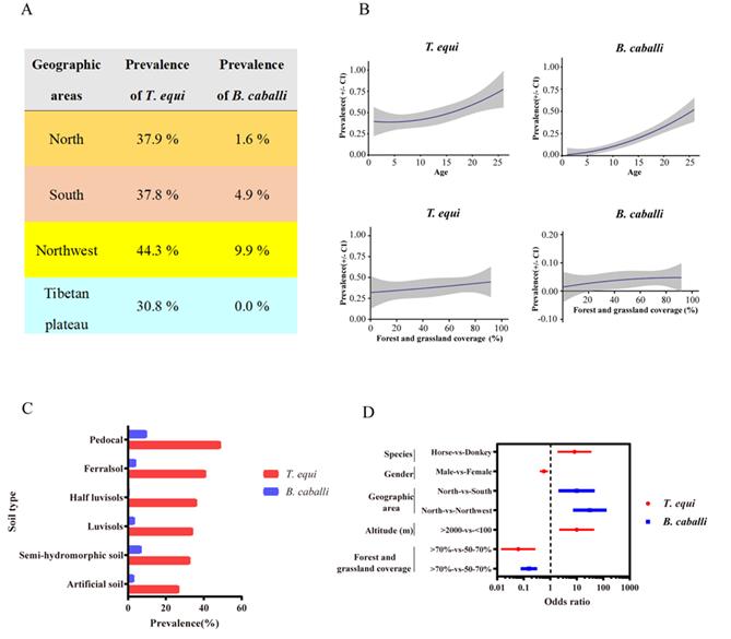 馬傳染病與慢病毒病團(tuán)隊(duì)針對我國國內(nèi)馬梨形蟲流行情況未知這一問題,基于已建立的診斷技術(shù),通過對全國20個(gè)省和地區(qū)的2444份馬屬動物血清樣品進(jìn)行了橫斷面統(tǒng)計(jì)分析,首次揭示了該病在全國范圍內(nèi)的流行情況和風(fēng)險(xiǎn)因素,證實(shí)了馬梨形蟲病在國內(nèi)呈區(qū)域性流行,以西北地區(qū)和東北地區(qū)較為嚴(yán)重,發(fā)現(xiàn)外部環(huán)境因素鈣層土、綠地覆蓋率和低海拔以及內(nèi)部動物因素種屬、性別和年齡是該病流行的主要風(fēng)險(xiǎn)因素。并且獲得了國內(nèi)流行馬梨形蟲的基因亞型譜以及發(fā)現(xiàn)了一種新的馬泰勒蟲基因亞型F型,相關(guān)研究結(jié)果以 “Prevalence and molecular epidemiology of equine piroplasmosis in China: a neglected tick-borne disease”為題,發(fā)表在國內(nèi)創(chuàng)辦的國際期刊《Science China Life Sciences》雜志上。哈爾濱獸醫(yī)研究所碩士研究生陳克偉和副研究員胡哲為共同第一作者,杜承副研究員和王曉鈞研究員為通訊作者。該研究為國內(nèi)對馬梨形蟲病的預(yù)防和控制奠定了基礎(chǔ)。