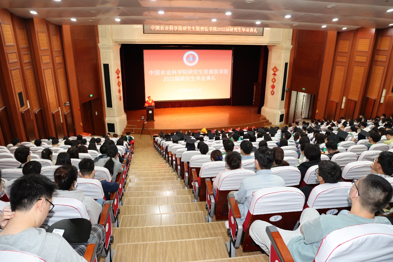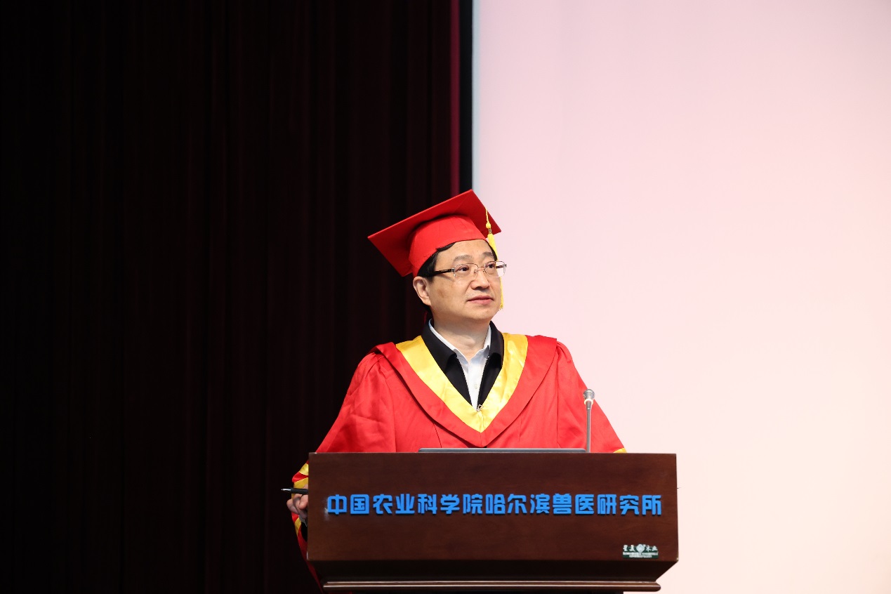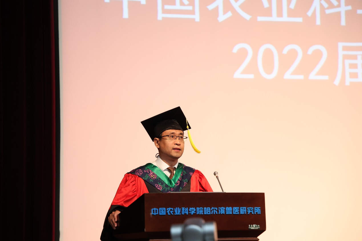 6月1日,中國農(nóng)科院研究生院獸醫(yī)學院2022屆研究生畢業(yè)典禮在哈爾濱獸醫(yī)研究所綜合樓召開。中國農(nóng)科院研究生院賈廣東書記、王述民副院長線上出席,中國農(nóng)科院哈爾濱獸醫(yī)研究所陳化蘭院士,獸醫(yī)學院院長、哈獸研步志高所長,王笑梅書記,劉勝旺副所長,馮力副所長,孫百明副所長,黨委委員張曉鵬主任,肇慶大華農(nóng)生物藥品有限公司陳瑞愛董事長,北京金諾百泰生物技術(shù)公司李剛董事長,北大荒牧業(yè)有限責任公司劉佳明總經(jīng)理、金勝柱副總經(jīng)理以及研究所職能部門負責人和創(chuàng)新團隊首席、班主任、導師、研究生300余人參加。典禮由獸醫(yī)學院常務(wù)副院長劉益民主持。