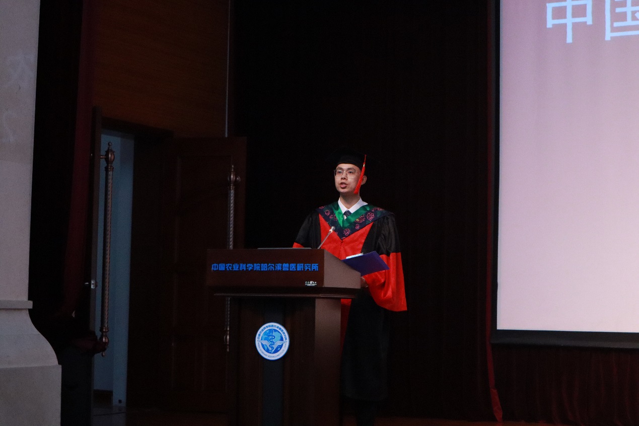 豬藍耳病與偽狂犬病研究團隊首席科學家安同慶研究員向畢業(yè)生送去美好祝福和囑咐,希望同學們要有積極樂觀的心態(tài)、要有自己的夢想,不斷拼搏、不斷超越自己!2018級博士張宇代表畢業(yè)生發(fā)言,他回憶了新冠疫情期間在獸醫(yī)學院、在哈獸研學習期間的點點滴滴,感謝全體老師的培養(yǎng)和幫助!2020級碩士王婉代表在校生發(fā)言,向即將離開獸醫(yī)學院和哈獸研的師兄師姐表達衷心的祝福,祝賀他們踏上新的征程,開啟人生新的篇章! MAMU、YEASSIN和TSEGAY等3名留學生也分享了他們的中國故事,表達對中國政府和研究所的感激之情。