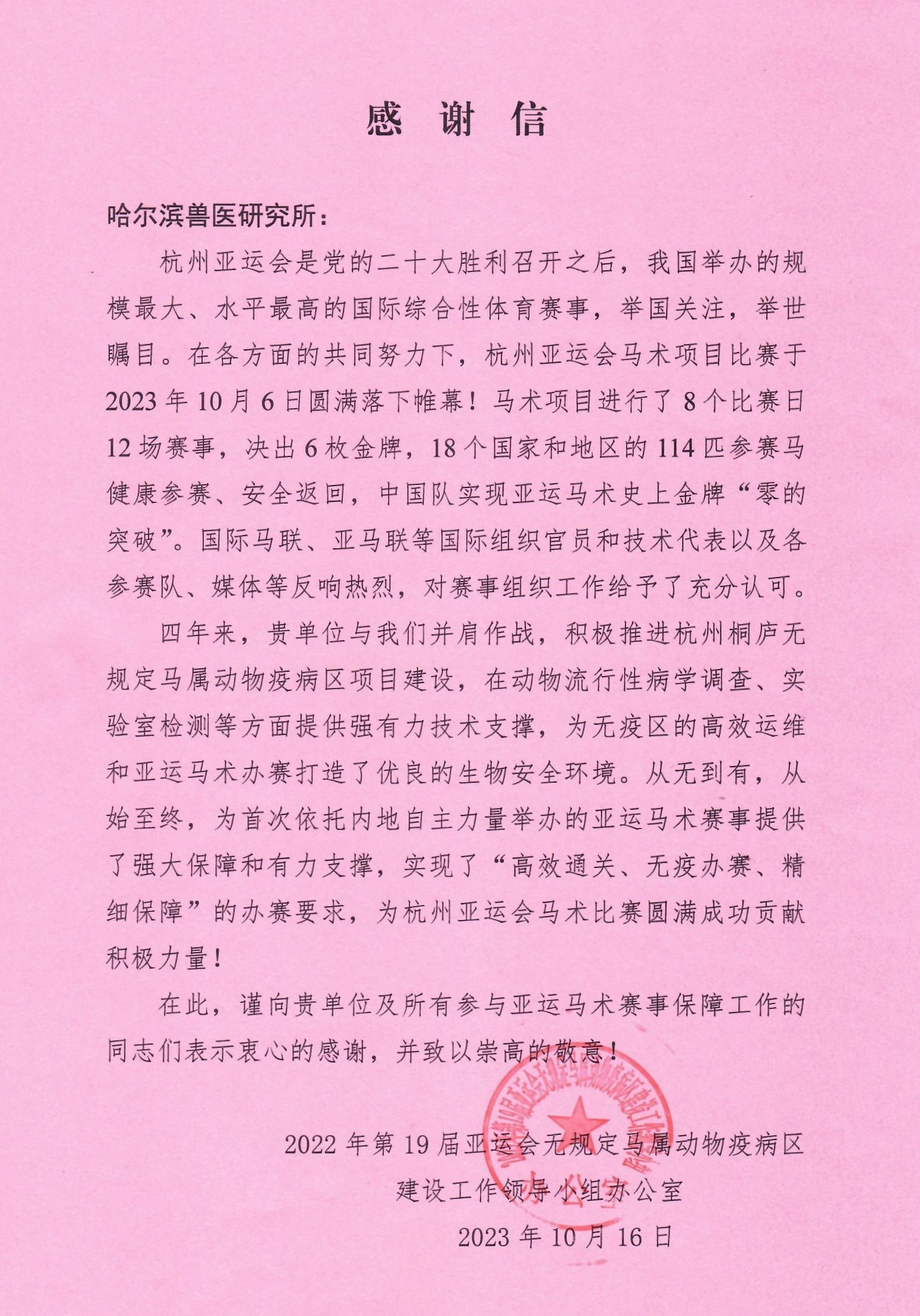2023年10月16日,2022年第19屆亞運(yùn)會(huì)無(wú)規(guī)定馬屬動(dòng)物疫病區(qū)建設(shè)工作領(lǐng)導(dǎo)小組辦公室向中國(guó)農(nóng)業(yè)科學(xué)院哈爾濱獸醫(yī)研究所(哈獸研)發(fā)來(lái)感謝信,感謝哈獸研“積極推進(jìn)杭州桐廬無(wú)規(guī)定馬屬動(dòng)物疫病區(qū)建設(shè),在動(dòng)物流行病學(xué)調(diào)查、實(shí)驗(yàn)室檢測(cè)等方面提供強(qiáng)有力技術(shù)支撐,為無(wú)疫區(qū)的高效運(yùn)維和亞運(yùn)馬術(shù)比賽打造了優(yōu)良的生物安全環(huán)境”。